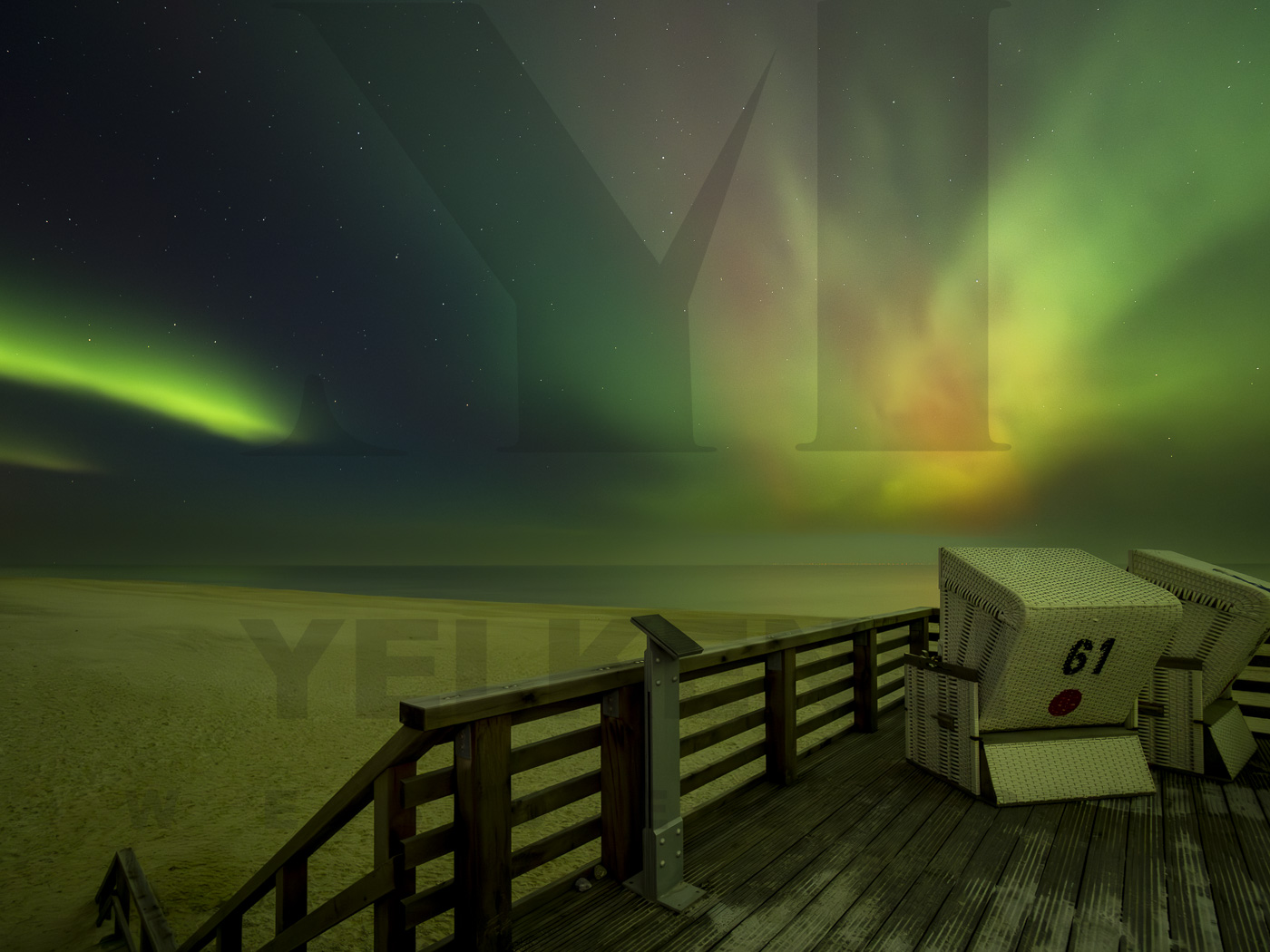 • Motiv: Leere Strandkörbe auf hölzerner Plattform, nächtlicher Sandstrand, Nordsee, intensive Polarlichter