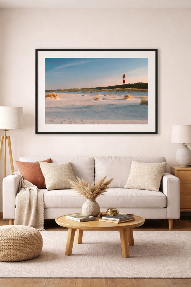In zarten Pastelltönen erstrahlt der Leuchtturm – ruhig eingebettet zwischen Sanddünen und Dünengras. Die weiche Abendsonne taucht die Szene in ein friedliches Licht, während das Rot-Weiß des Turms Orientierung und Symbolkraft vereint. „Fernblick“ lädt zum Innehalten ein: ein Bild über Weite, Stille und das sichere Gefühl, geführt zu werden – egal, wie weit man sich vom Ufer entfernt.