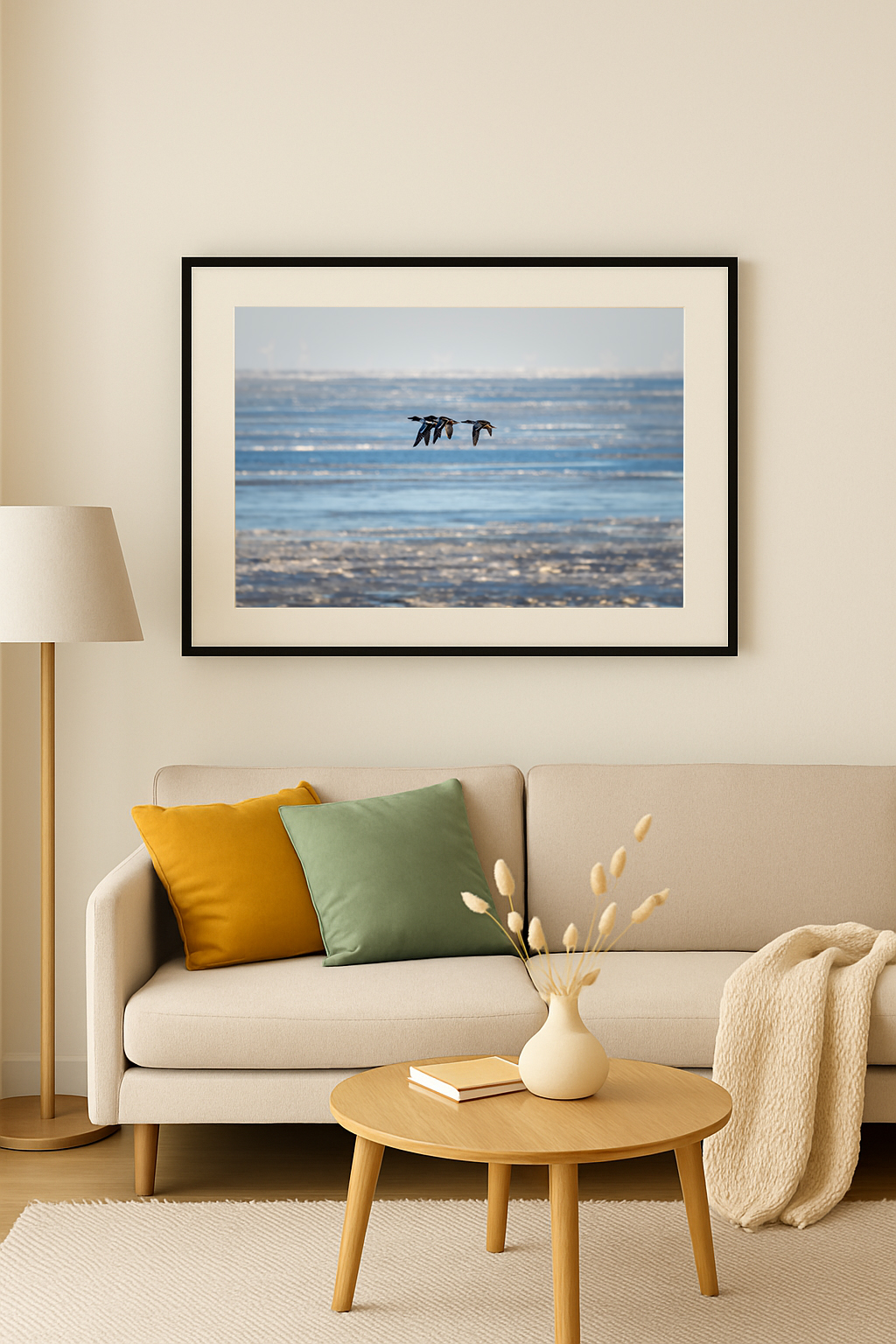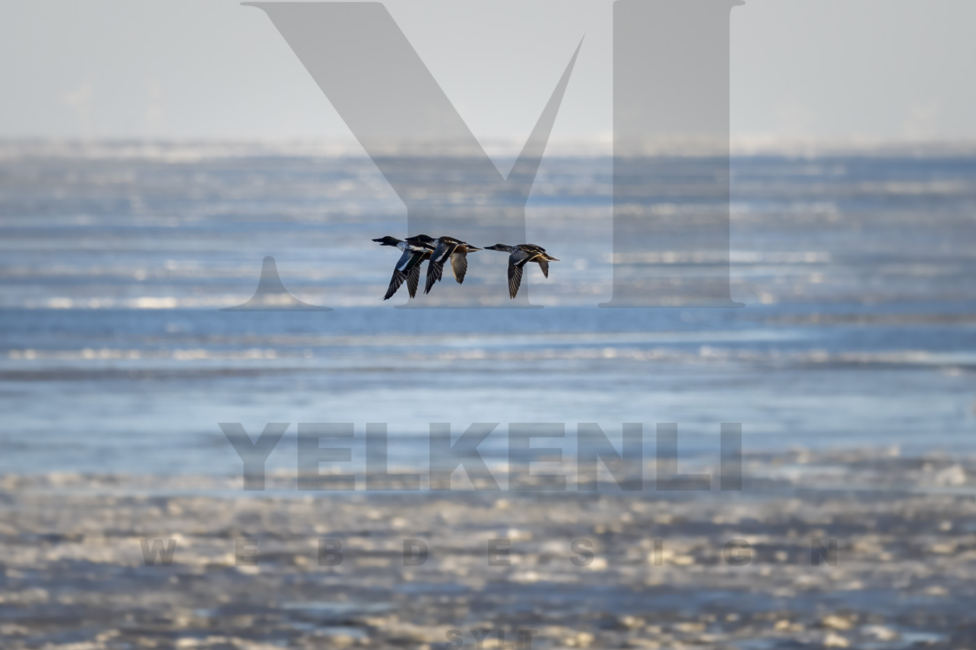 Ein Moment der Leichtigkeit im rauen Inselklima: Diese Gruppe von Enten gleitet in präziser Formation über das gefrorene Watt vor Sylt. In der klaren Winterluft wirken ihre Silhouetten fast grafisch – reduziert auf Bewegung, Richtung und Verbundenheit. Ein Stillleben in Bewegung, eingefangen in eisiger Stille.